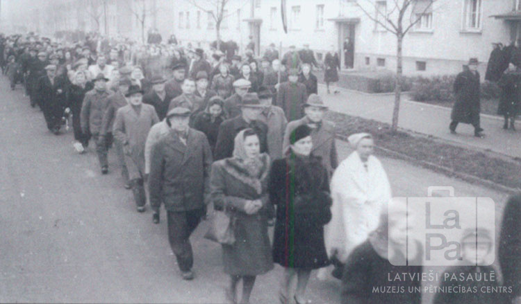 Liels laužu gājiens pa ielu Hohfeldes nometnē Augsburgā (amerikāņu zonā) 20. gs. 40-tajos gados,18. novembrī. Fonā redzami no ēkām ārā nākoši cilvēki. Otrajā rindā, trešā no kreisās (gaišā tautastērpā): Anna Tuims (pr. Wilson). Par šo gadījumu Ausma Wilson (dz. Tuims) atceras: "Svinīgs nometnes gājiens 18.novembrī. Mana māte Anna Tuims redzama tautas tērpā."