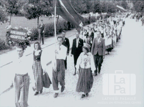 Svinīgs gājiens Dziesmu svētkos kādā no Vācijas pēckara nometnēm. Sievietes tautastērpos, vīri svinīgos kreklos un uzvalkos. Pirmajam gājiena dalībniekam lapu vainags ar uzrakstu "AUGSBURGA HOCHFELDA". Vairāki gājiena dalībnieki rokās tur Latvijas valsts karogu.