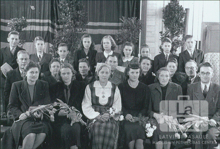 Pamatskolas skolotāji, pēdējās klases bērni un vecāki izlaidumā Hohfeldes nometnē Augsburgā (amerikāņu zonā). Cilvēkiem priekšējā rindā klēpī ziedi. Telpas aizmugurē meijas un aizvilkts skatuves priekškars.
