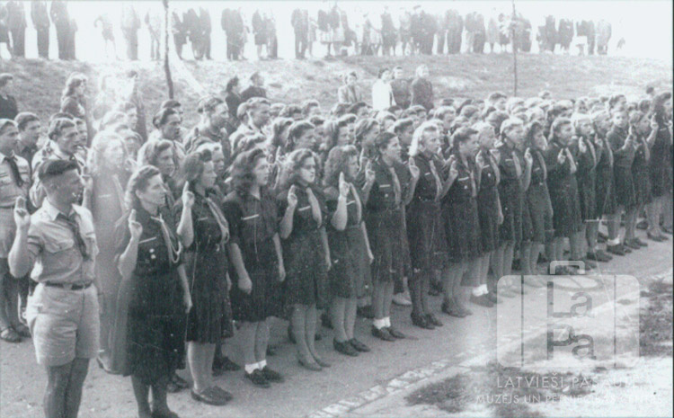 Gaidas formastērpos nostājušās ar paceltu labo roku svinīgā brīdī Hohfeldes nometnē Augsburgā (amerikāņu zonā). Aizmugurē uz zemes vaļņa redzami skatītāji.