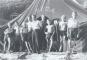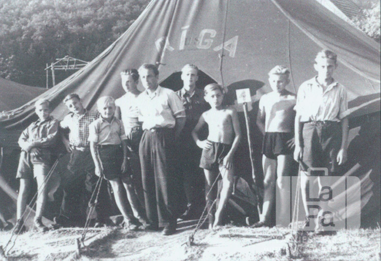 Skautu grupa pie telts vasaras nometnē (amerikāņu zonā). Virs telts ieejas uzraksts "RĪGA".
