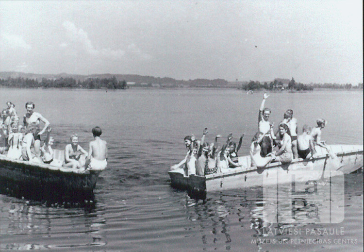 Izbrauciens ar divām laivām vasaras nometnē bērniem no Augsburgas (amerikāņu zonā). Katrā laivā redzami virs desmit bērniem. Tālumā ezera krasts.