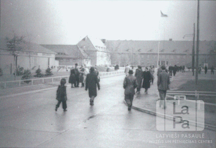 Salijusi iela ar cilvēkiem izbraukšanas nometnē Brēmerhāfenē (amerikāņu zonā). Fonā vairākstāvu ēkas.