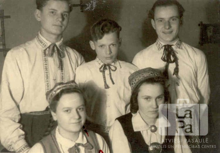 Pieci pamatskolas absolventi Rendsburgas nometnē (angļu zonā). Visi jaunieši tautastērpos. Pirmajā rindā, no kreisās: Anna Vārpa un Ausma Ostele (pr. Linde). Otrajā rindā, no kreisās: Valdis Reinfelds, Gunārs Âriņš un Gunārs Dzintars.