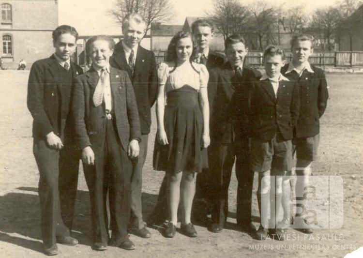 Jauniešu grupa stāv laukumā Lieldienās Rendsburgas nometnē (angļu zonā). Fonā redzamas ēkas, žogs un koki bez lapām.No kreisās: Ivars Trepiņš, Herberts Lazdiņš, Maigonis Otto, Ausma Ostele (pr. Linde), Arnis Kauliņš, Imants Zariņš, Gunārs Āriņš un Gunārs Dzintars.