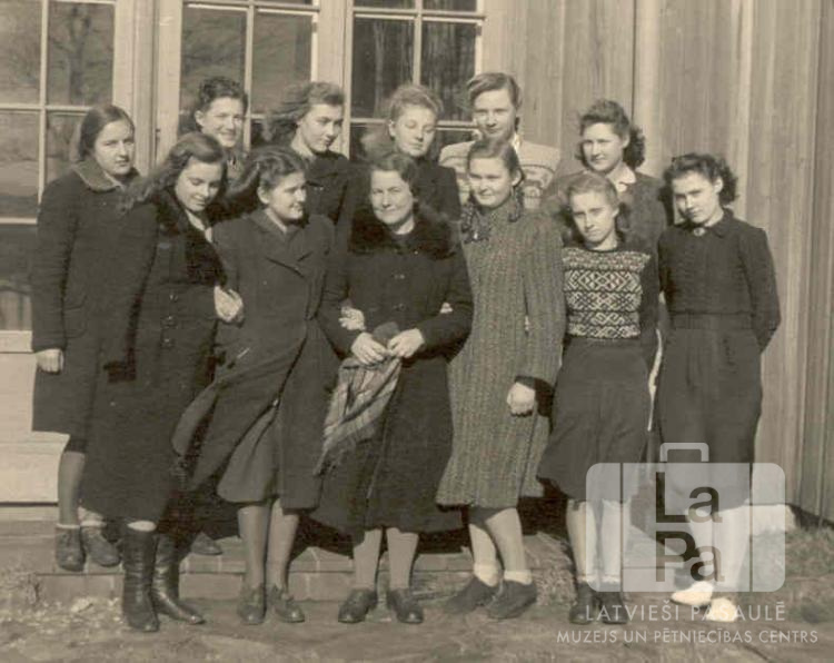 Ģimnāzijas 1. klases meitenes ar klases audzinātāju Pinnebergas nometnē (angļu zonā) 1948.–1949. mācību gadā. Aizmugurē koka ēka ar rūtotiem logiem. Pirmajā rindā, no kreisās: Irēne Venclavoviča, Tatjāna Klarka, klases audzinātāja E. Ābele, Rasma Markova, Lilija Kārkliņa un Ausma Ostele (pr. Linde). Otrajā rindā, no kreisās: Lonija Skrūzmane, Velta Leno, Inta Gruzna, Gaida Barbāne, Pegija Skrastiņa un Lija Lazdiņa.