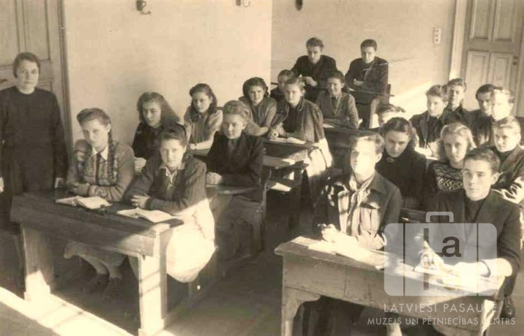 Ģimnāzijas 1. klases ar klases audzinātāju savā klases telpā Pinnebergas nometnē (angļu zonā) 1948.–1949. mācību gadā. Stāv klases audzinātāja E. Ābele. Solos sēž: kreisajā pusē – pirmajā solā Pegija Skrastiņa un Lija Lazdiņa; otrajā solā Inta Gruzna un Gaida Barbāne; trešajā solā Irēne Venclavoviča; ceturtajā solā Tatjāna Klarka un Rasma Markova; piektajā solā Lonija Skrūzmane un Velta Leno; sestajā solā Alfrēds (Dižais) Rolle un Zigurds Kaņeps. Labajā pusē – pirmajā solā Erasts Rēdiņš un Gunārs Ozoliņš; otrajā solā Ausma Ostele (pr. Linde) un Lilija Kārkliņa; trešajā solā Artūrs Blausde; ceturtajā solā Juris Press un Zigurds Zemgals; piektajā solā ? Galviņš un Andrievs (Staļins) Štāls.