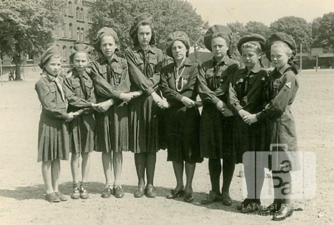 Mežotnes 17. gaidu vienības meitenes formastērpos laukumā Rensburgas nometnē (angļu zonā) 1947. gada vasarā. Fonā vairākstāvu ēkas. No kreisās: ceturtā Ausma Ostele (pr. Linde), piektā vadītāja Edīte Leona, sestā Anna Vārpa, septītā Aloizija Ligita Galviņa.