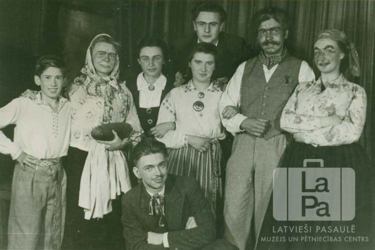 Dramatiskas kopas uzveduma “Brīnumzālīte” dalībnieku grupa kostīmos (arī – tautastērpos) un grimā Augsburgā (amerikāņu zonā).