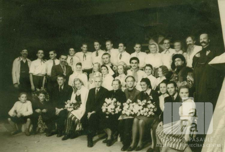 Cilvēku grupa uz skatuves mīkales “Mārtiņdiena” kopuzņēmumā Augsburgā (amerikāņu zonā). Mīkales autors: Arvīds Brastiņš. Pirmajā rindā, no kreisās puses: trešais inspektors N. Zarevičs, ceturtā skolotāja M. Rozentāle, piektais skolas direktors E. Aistars, sestā skolotāja V. Delle-Grāvīte, septītais režisors Raimonds Miesnieks, astotā skolotāja Z. Lapiņa.