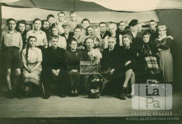 R. Blaumaņa uzveduma "Trīnes grēki" aktieru grupa uz skatuves Augsburgā (amerikāņu zonā). Pirmajā rindā, ceturtais no kreisās (ar ziediem): režisors R. Miesnieks.