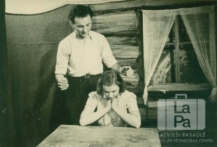 Divi aktieri tērpos R. Blaumaņa izrādē "Trīnes grēki" Augsburgā (amerikāņu zonā). Redzams skatuves iekārtojums – guļbaļķu mājas siena ar logu un galds. No kreisās: Gunards Hāns un Maija Ošiņa.