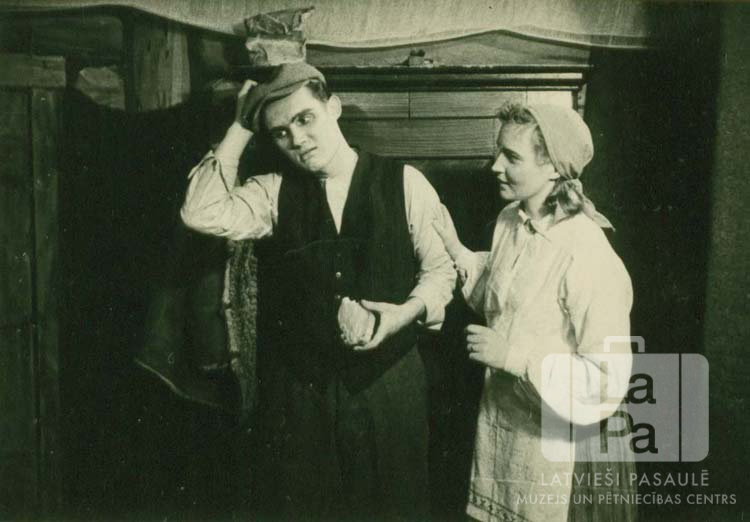 Divi aktieri tērpos R. Blaumaņa uzvedumā "Trīnes grēki" Augsburgā (amerikāņu zonā). No kreisās: Guna Kaulēna un Ojārs Ritums.