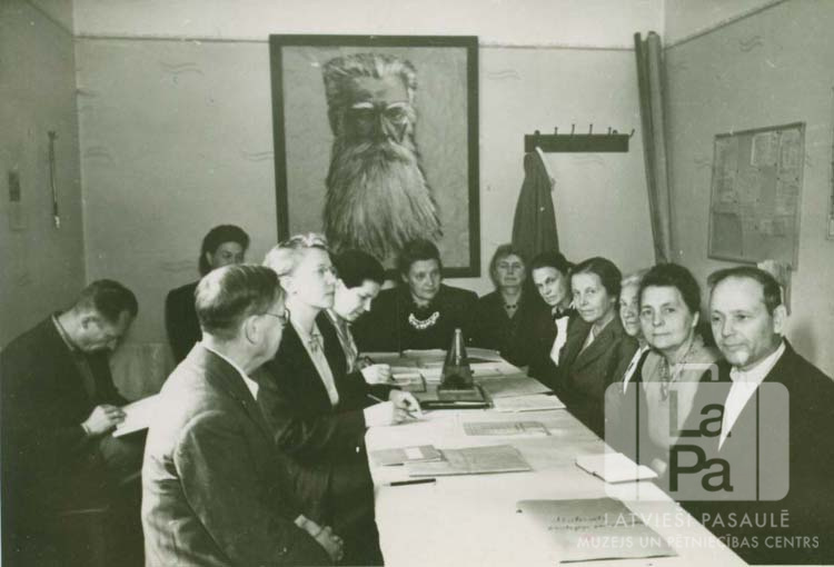 Skolotāji sēž ap garu galdu skolotāju istabā Hohfeldes nometnē Augsburgā (amerikāņu zonā). Aizmugurē pie sienas liels K. Barona portrets. No kreisās, sākot ar galda galu: Marija Spalviņa, Irēne Karule, Vera Pētersone, Elizbete Zandersone, Leontine Sniķere un Alvīne Sinepe.