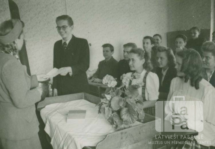 Skolotāja M. Rozentāle skolēnu priekšā apsveic audzēkni Māri Ubānu trešajā klasē Hohfeldes nometnē Augsburgā (amerikāņu zonā). No kreisās: skolotāja M. Rozentāle, Māris Ubāns, (pirmajā solā) – Rainis Krīgens un Jānis Indāns.