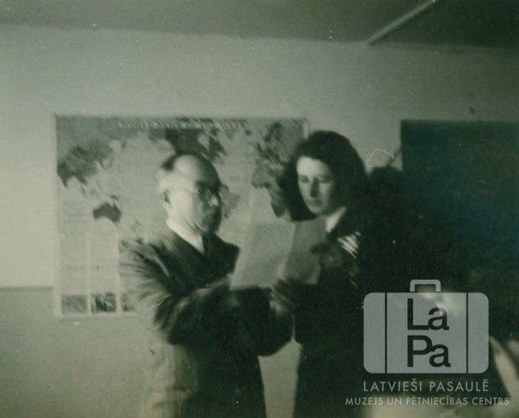 Skolotājs J. Stengrevics skaidro Birutai Kalējai kādu pareizrakstības noteikumu Hohfeldes nometnē Augsburgā (amerikāņu zonā) 1947.–1948. gadā. Aizmugurē uz sienas pasaules karte.