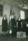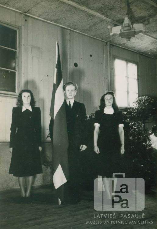 Karoga goda sardze izlaiduma akta svinībās Hohfeldes nometnes sarīkojumu telpās Augsburgā (amerikāņu zonā). Pie Latvijas karoga, no kreisās: Biruta Kalēja (pr. Abuls), Illars Sirks, Tamāra Vilkina.