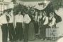 Puiši un meitenes ar Jāņu vaiņagiem un tautastērpos meiteņu apdziedāšanās brīdī uzvedumā ”Jāņu vakars Kalniešos“ Augsburgā (amerikāņu zonā). Telpa izpušķota ar koku zariem un segu pie sienas.