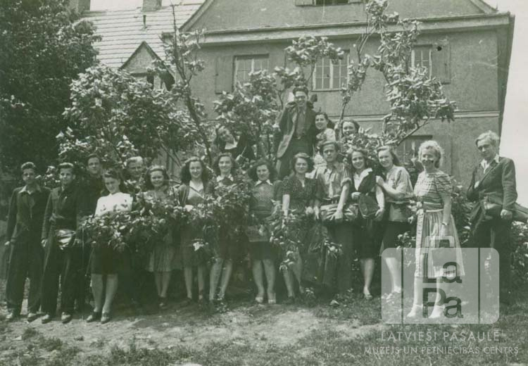 Jauniešu grupa stāv ārā pie meijām, ar ziediem rokās. Fonā māja.