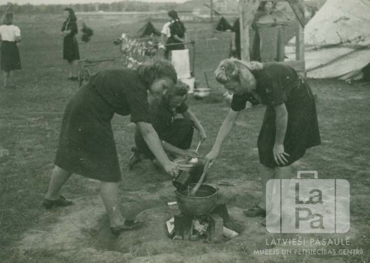 Trīs meitenes rosās ap nelielu katlu uz ugunskura gaidu nometnē Augsburgā (amerikāņu zonā). Fonā telts un citas meitenes.
