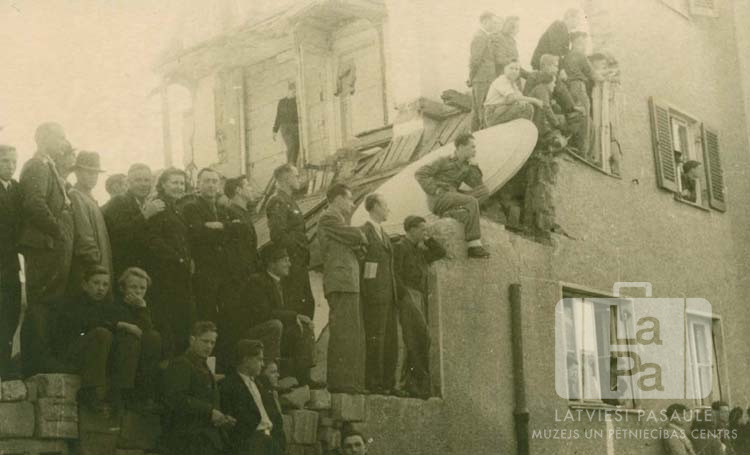 Cilvēku pūlis, sakāpis logos un uz mājas mūriem, vēro sporta spēles Hohfeldes nometnes pagalmā Augsburgā (amerikāņu zonā).