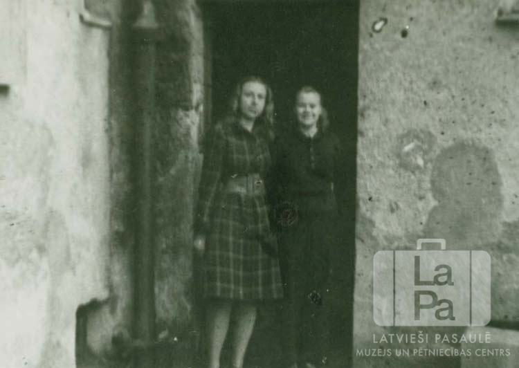 Divas meitenes stāv nometnes ejas durvīs Augsburgā (amerikāņu zonā). No kreisās: Indra Rutka un Aina Krieviņa.