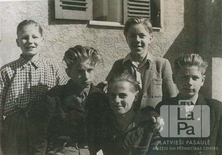 Pieci puikas pozē pie mājas sienas Augsburgā (amerikāņu zonā). No kreisās: Sigurds Krolls, Andris Ubāns, Andris Ronis, Modris Žulps. Aizmugurē Ēriks Upmanis. Par šo gadījumu Biruta Abuls (dz. Kalēja) atceras: "Manas klases puikas."