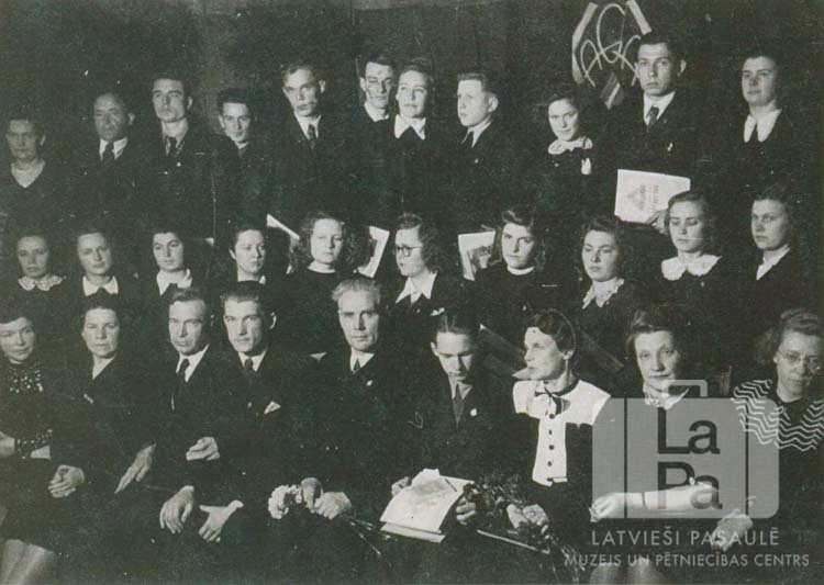 Skolotāji un audzēkņi svinīgos tērpos skolas izlaidumā Hohfeldes nometnē Augsburgā (amerikāņu zonā).