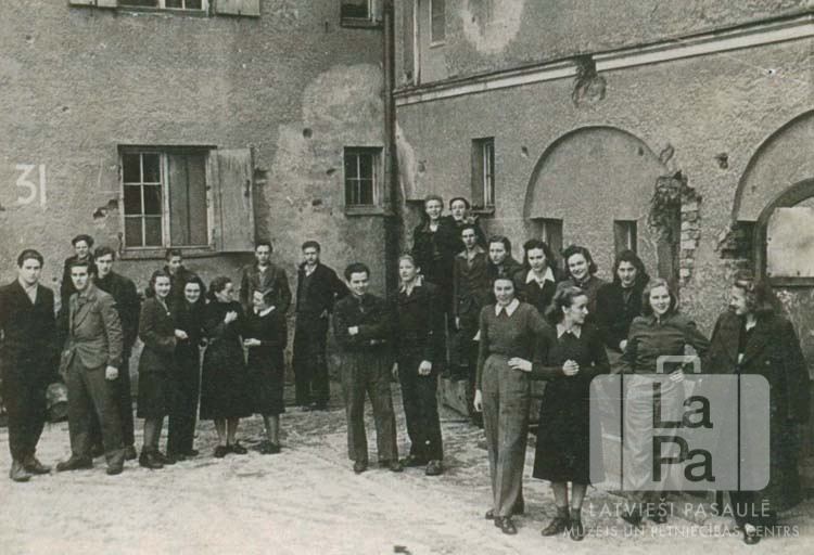 Jauniešu grupa stāv pie ēkas skolas pagalma stūrī Hohfeldes nometnē Augsburgā (amerikāņu zonā).