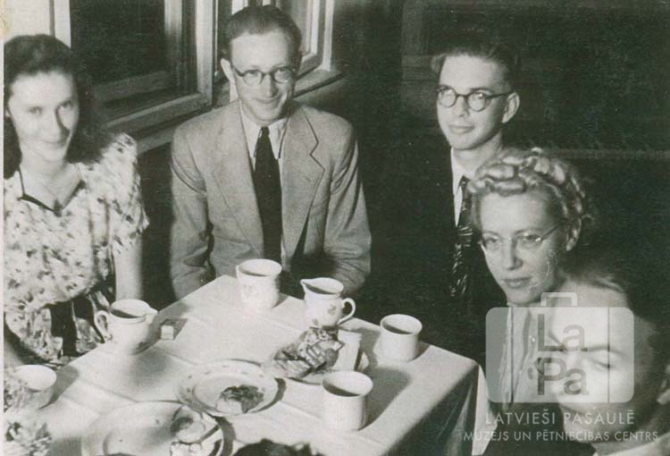 Pieci cilvēki svinīgos tērpos sēž pie kafijas galda Augsburgā (amerikāņu zonā). Uz galda krūzes un šķivji. No kreisās: Alma Prīlape, Imants Kalniņš, Māris Ubāns, skolotāja M. Rozentāle, R. Miesnieks.