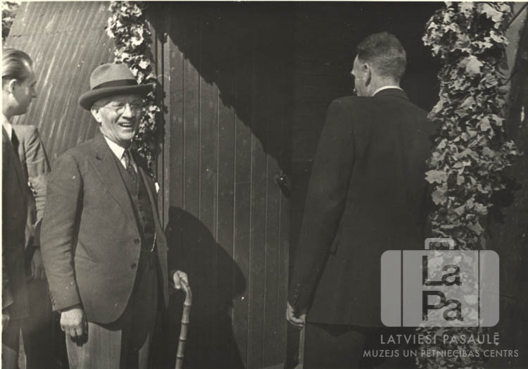 Trīs vīrieši ACCU nometnē Hannoverē (angļu zonā) stāv pie ēkas ieejas durvīm Latvijas republikas sūtņa Lielbritānijā vizītes laikā. Ēkas ieeja izrotāta ar koku lapu virteni. No kreisās: ? Nāgels, vēstnieks K. Zariņš, Richards Pops.