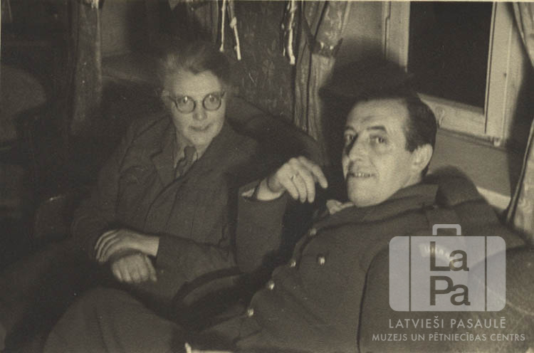 Nometnes māsiņa un komandants sēž uz dīvāna ACCU nometnē Hannoverē (angļu zonā). Komandantam uz pleca salasāms uzraksts: "UNRRA". Aizmugurē uzraksts: "Christmas party at Anita’s club 28/12/46.”