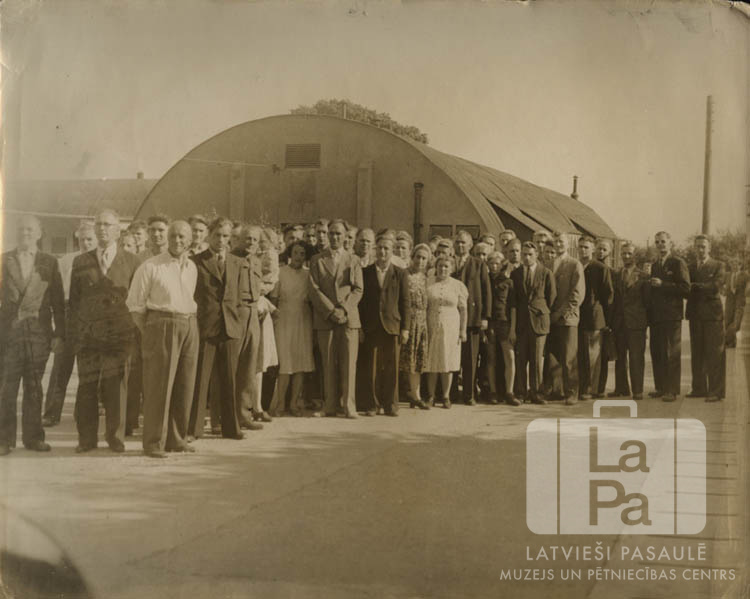 Cilvēku grupa stāv laukumā ACCU nometnē Hannoverē (angļu zonā). Fonā vairākas ēkas.