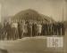 Lielas ļaužu grupas fotogrāfija. Fonā ēkas.