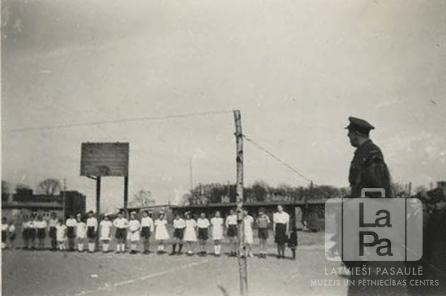 Bērni un jaunieši sporta tērpos stāv rindā sporta laukumā sporta svētkos ACCU nometnē Hannoverē (angļu zonā) 1946. gada pavasarī. Aiz jaunieši basketbola grozs; labajā pusē skatītāji.