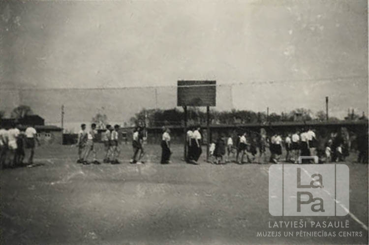 Bērni un jaunieši iet pāri sporta laukumam sporta svētkos ACCU nometnē Hannoverē (angļu zonā) 1946. gada pavasarī. Aiz viņiem redzams basketbola grozs un vairākas vienstāvu ēkas.
