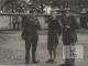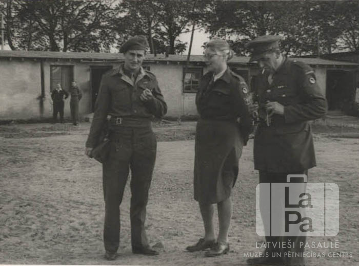 Divi vīrieši un sieviete formastērpos pagalmā ACCU nometnē Hannoverē (angļu zonā) 1946. gada vasarā. Fonā divi cilvēki stāvi pie garas vienstāvu barakas. No kreisās: virsnieks (dānis), māsiņa (holandiete), komandants (beļģis).
