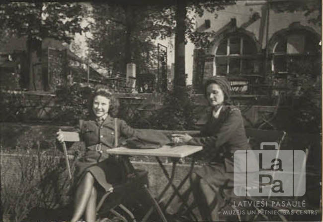Divas sievietes sēž ārā pie galdiņa ACCU nometnē Hannoverē (angļu zonā) 1946. gada vasarā. Fonā koki un vairākas ēkas. No kreisās: "velfēriete” (francūziete), komandanta sekretāre (igauniete).