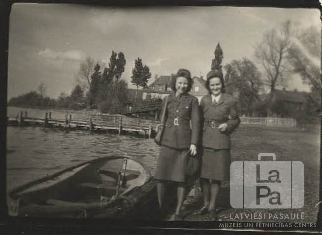 Divas sievietes ūdens malā ACCU nometnē Hannoverē (angļu zonā) 1946. gada vasarā. Viņām blakus laiva. Fonā neliela laivu piestātne, koki un vairākas ēkas. No kreisās: "velfēriete” (francūziete), komandanta sekretāre (igauniete).