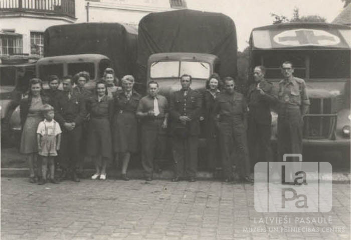 Cilvēku grupa pie smagajām automašīnām ielas malā ACCU nometnē Hannoverē (angļu zonā) 1946. gada rudenī. Fonā vairākstāvu ēkas.