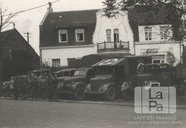 Ielas malā novietotas automašīnas ACCU nometnē Hannoverē (angļu zonā) 1946. gada rudenī. Fonā vairākstāvu ēkas. Automašīnām priekšā cilvēku grupa.