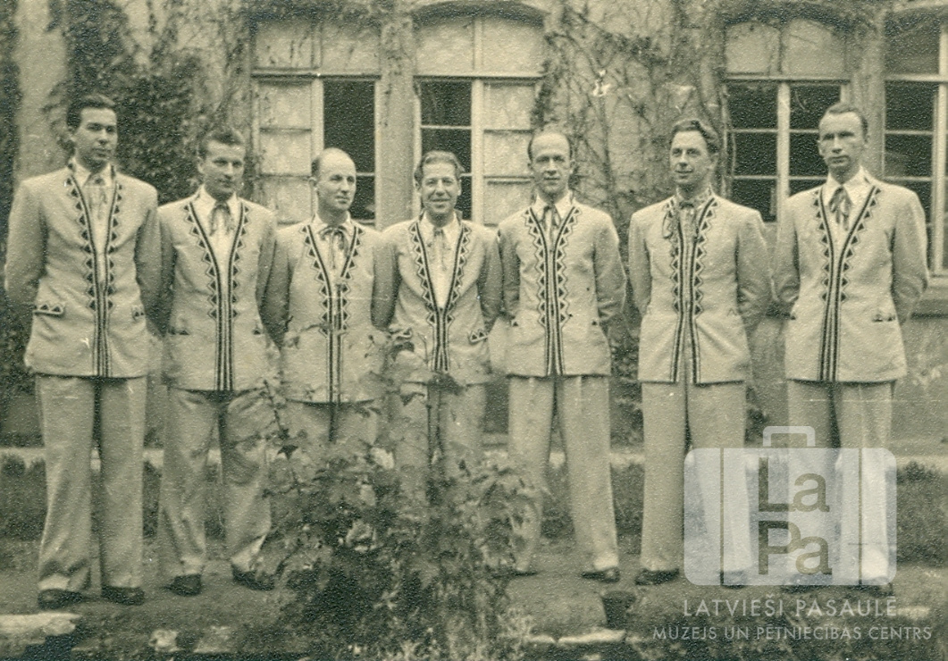 Septiņi vīrieši tautastērpos – vīriešu ansamblis "Kuršu vīri, latvju dēli e-he dēli” – Mērbekas nometnē (angļu zonā) 1947.–1948. gadā.
