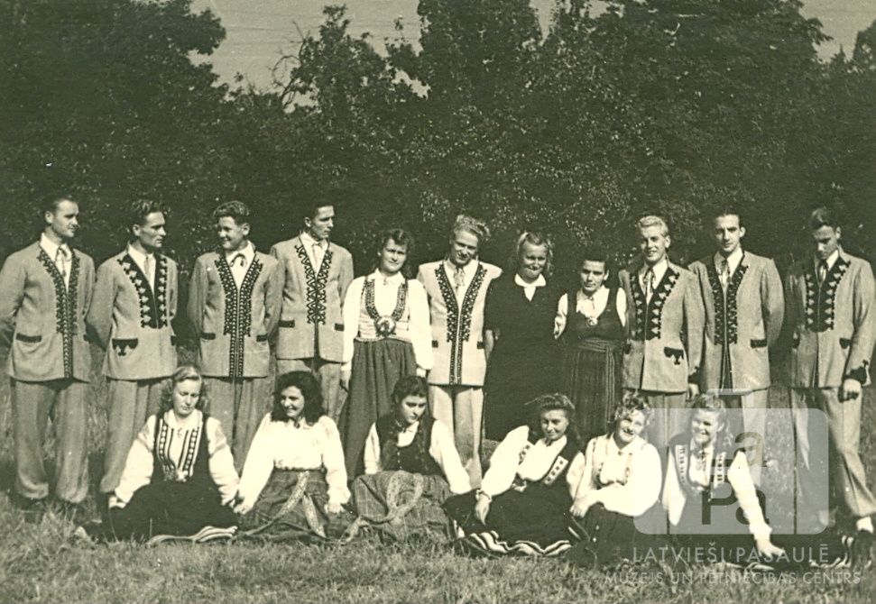 Tautas deju grupa ar vadītājiem sēž zālē Mērbekas nometnē (angļu zonā) 1947.–1948. gadā. Fonā koki. Vidū vadītāji Gaida un Arnolds Bāliņi.
