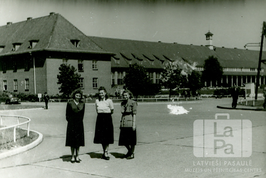 Trīs sievietes Gronas caurbraukšanas nometnes laukumā pie Brēmerhāfenes (angļu zonā), gaidot viņu kuģa ierašanos Brēmenhafenē. Aizmugurē trīsstāvu dzīvojamā ēka. No kreisās: Asja Īviņa, Biruta Kaljo (dz. Hermane) un Irēna Īviņa.
