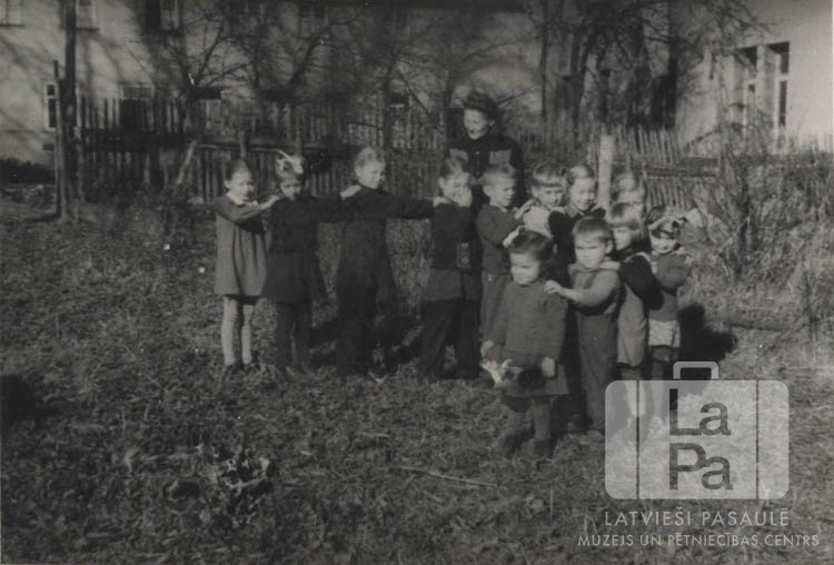 Bērnudārza bērni stāv Rotveiles nometnē (franču zonā), uzlikuši viens otram rokas uz pleciem. Aiz viņiem stāv skolotāja Anna Dūmiņa. Fonā žogs, koki un vairākas ēkas.