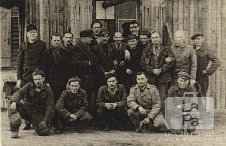 Vīriešu grupa ēkas priekšā Mīldorfā (amerikāņu zonā). Par šo gadījumu Biruta Zommere (dz. Segliņa) atceras: "Daudzi Mīldorfas nometnes vīrieši strādāja IRO automašīnu labošanas un novietnes centrā. Fotogrāfijā redzama šo darbinieku grupa."
