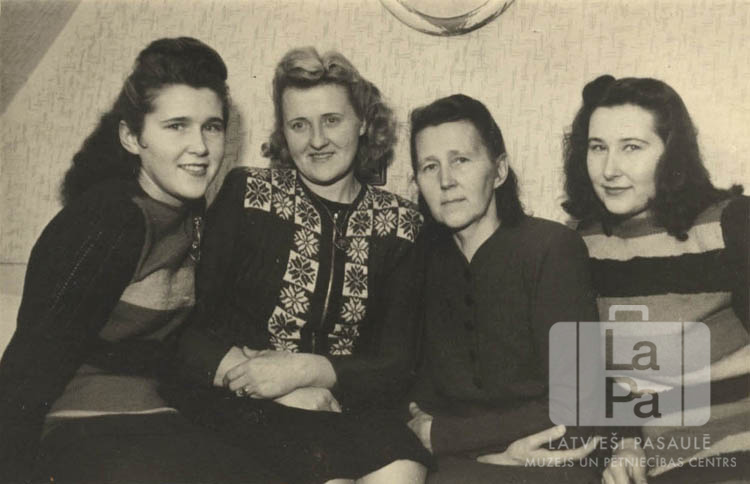 Četras sievietes draudzīgi sēž rindā Mīldorfā (amerikāņu zonā). No kreisās: No kreisās: Biruta Segliņa, Vilma Blunava, Anna Segliņa, Ilga Segliņa - Krūmiņa.