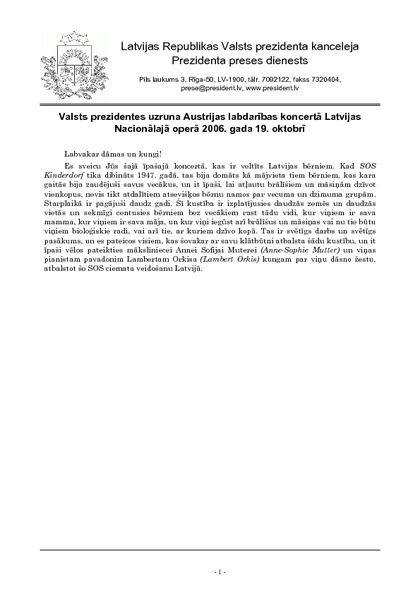 Valsts prezidentes uzruna Austrijas labdarības koncertā Latvijas Nacionālajā operā 2006. gada 19. oktobrī