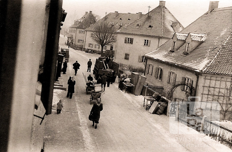 Ielas skats ar dzīvojamajām ēkām Eihfeldas nometnē Mīldorfā (amerikāņu zonā) ap 1947. gadu. Uz ielas redzama smagā kravas mašīna un cilvēki, kuri pārvieto mēbeles. Uz jumtiem/ ielas redzams sniegs.