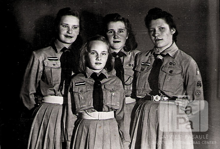 Četras gaidas no Kazdangas gaidu vienības Kaiju kopas Mīldorfā (amerikāņu zonā) ap 1947. gadu. No kreisās: Ilze Kažoka, Edīte Junde, kopniece Biruta Segliņa, Rūta Zāmele.
